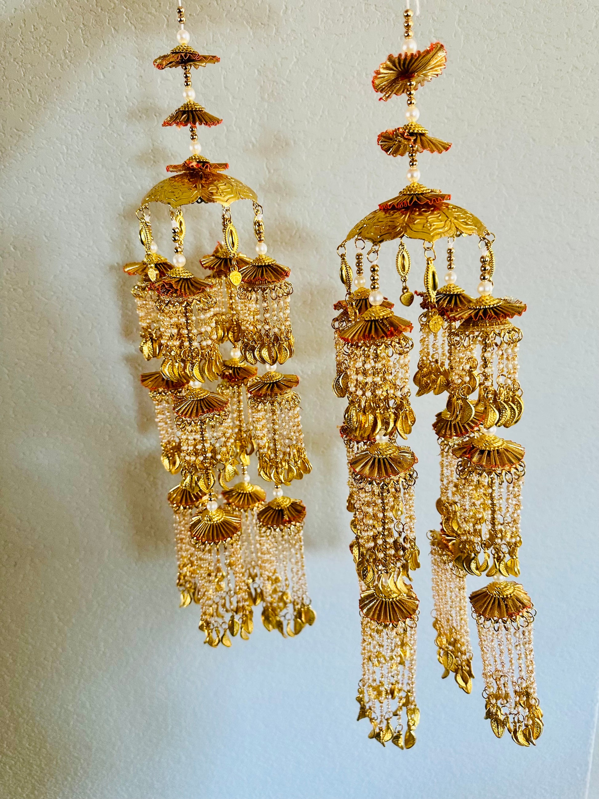Beautiful long gold and pearl decorated kaleere. These kaleere do not have attached bangles, but instead have a dori to easily attach to your bridal bangles.