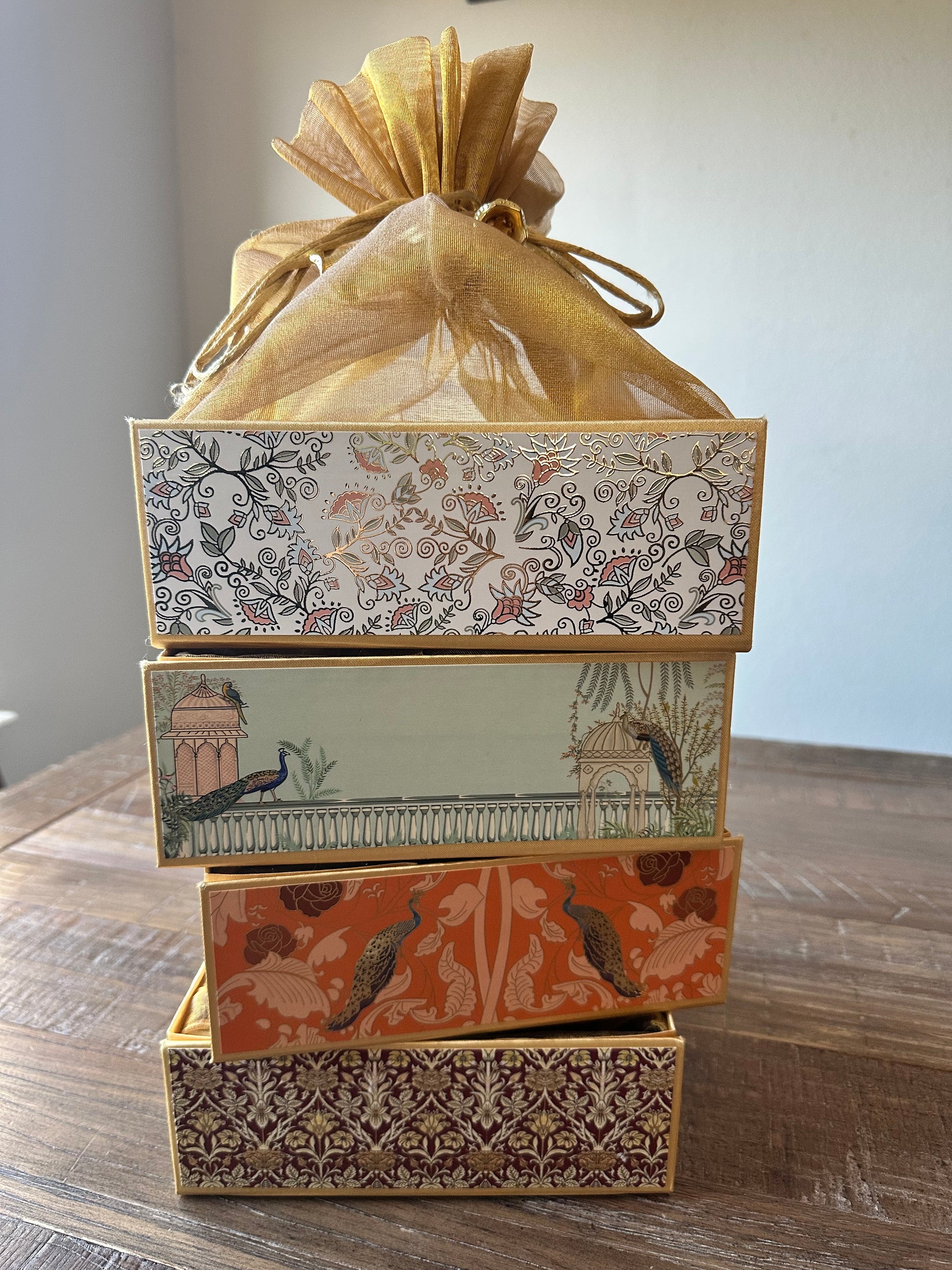 Elevate your gift presentation with this exquisite 8x8 inch Potli Box, a timeless choice for weddings, celebrations, and special occasions. Featuring a vibrant printed design enhanced with luxurious gold foiling, this box exudes elegance and refinement. The attached organza drawstring adds a graceful finishing touch, making it perfect for presenting favors, jewelry, or cherished gifts.